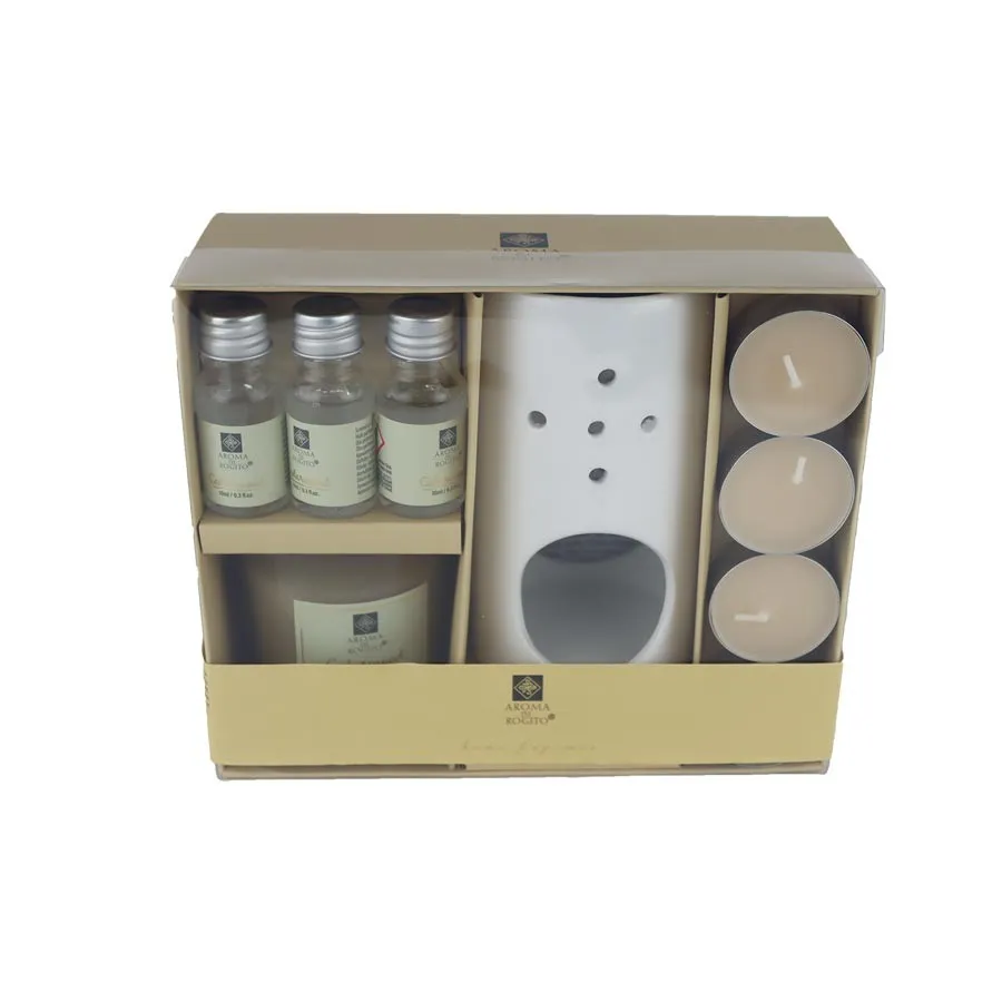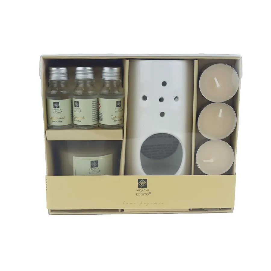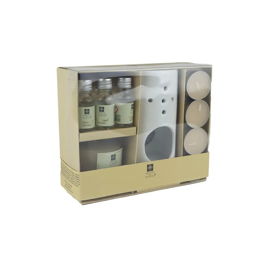 Das Geschenkset beinhaltet eine Aromalampe, 3 Öle, 1 Duftkerze und 4 Duftteekerzen.