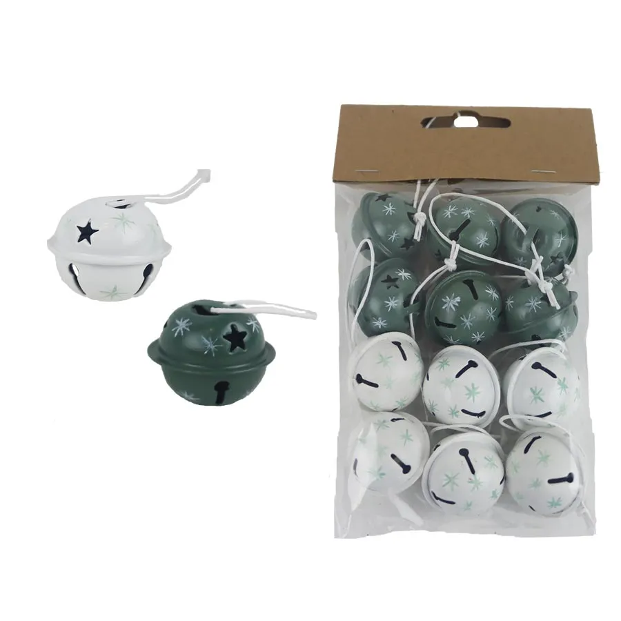 Set dekorativer Glocken zum Hängen. Das Set enthält 12 Glocken. Maße: Farbe: Kombination grün, weiß. Material: Metall.