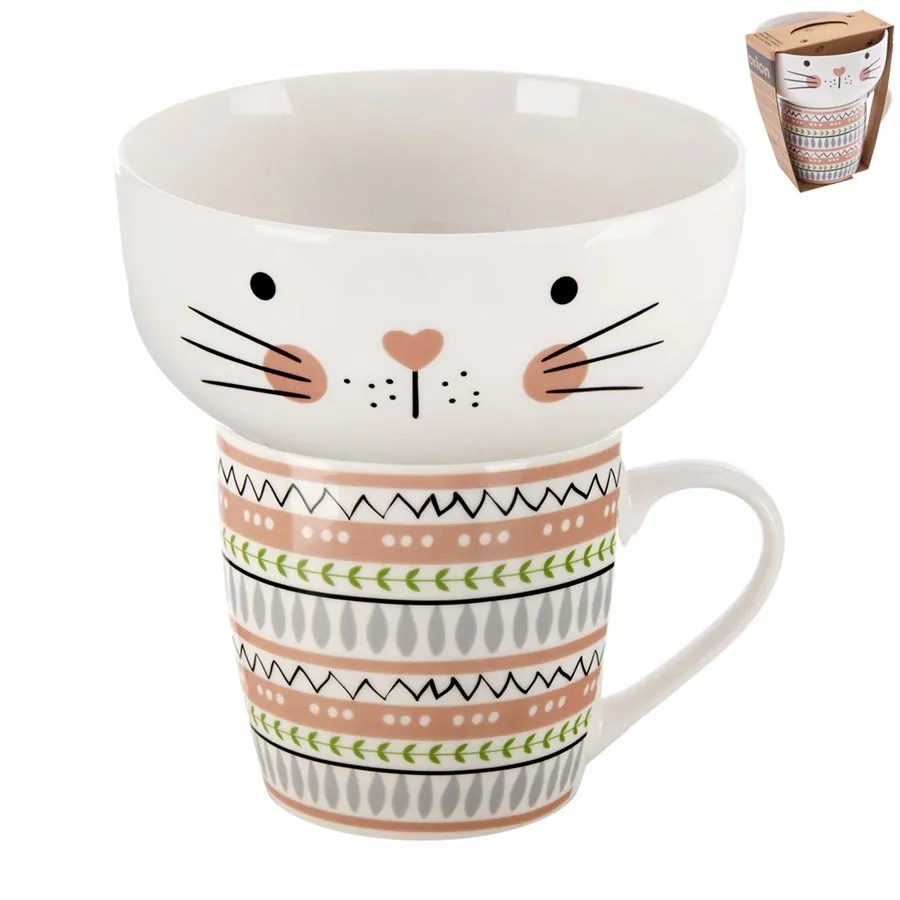 Der Porzellanbecher mit CAT-Dekor wird durch die mitgelieferte Schüssel ergänzt.