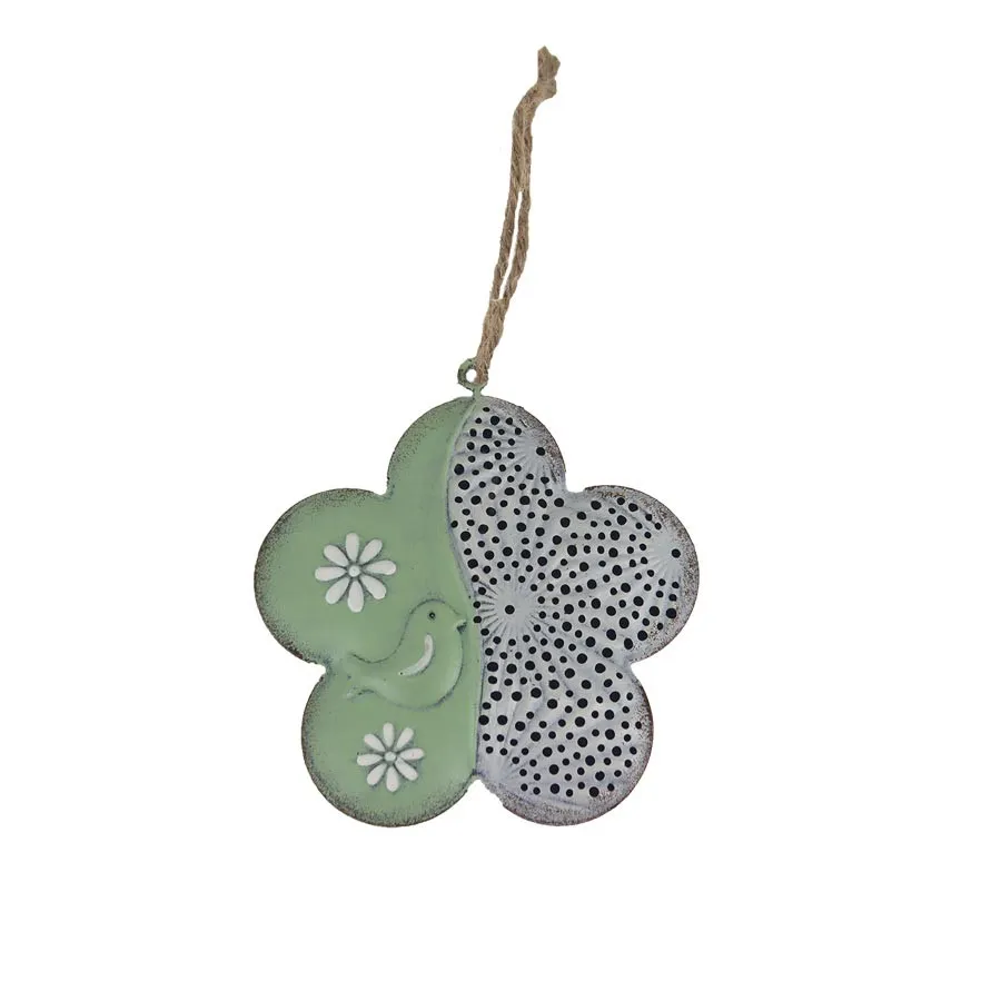 Dekorative Blume zum Aufhängen. Maße: Durchmesser 8,5 cm, Dicke 1,2 cm. Farbe: Kombination Grün, Weiß. Material: Metall.