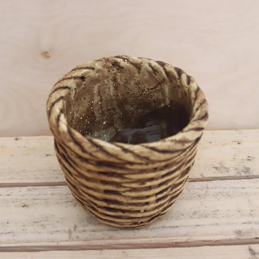 Dekorative Abdeckung für einen Blumentopf. Maße: Durchmesser 14 cm, Höhe 12,5 cm. Graue Farbe. Material: Beton.