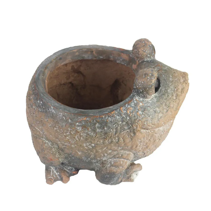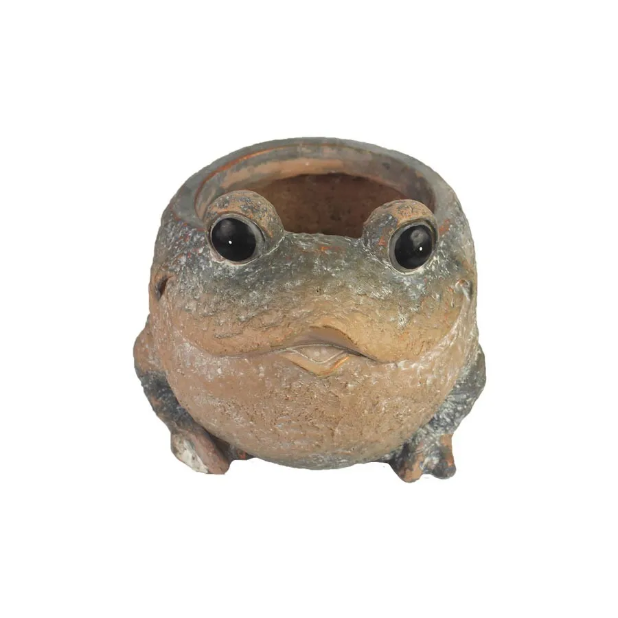 Dekorativer Blumentopf in Form eines Frosches. Maße: 30 x 26,5 cm, Höhe 22,5 cm. Farbe: Kombination aus Braun und Grau. Material: Magnesium.