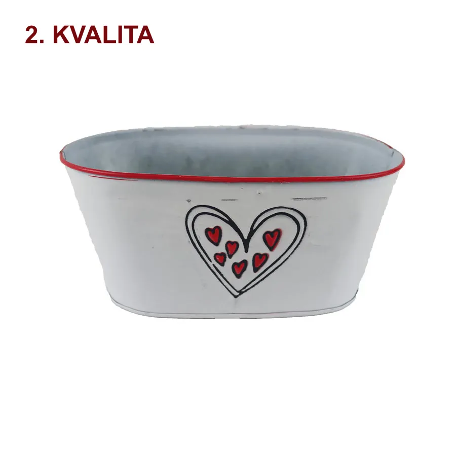 Ovaler Blumentopf aus Metall mit Herzen.