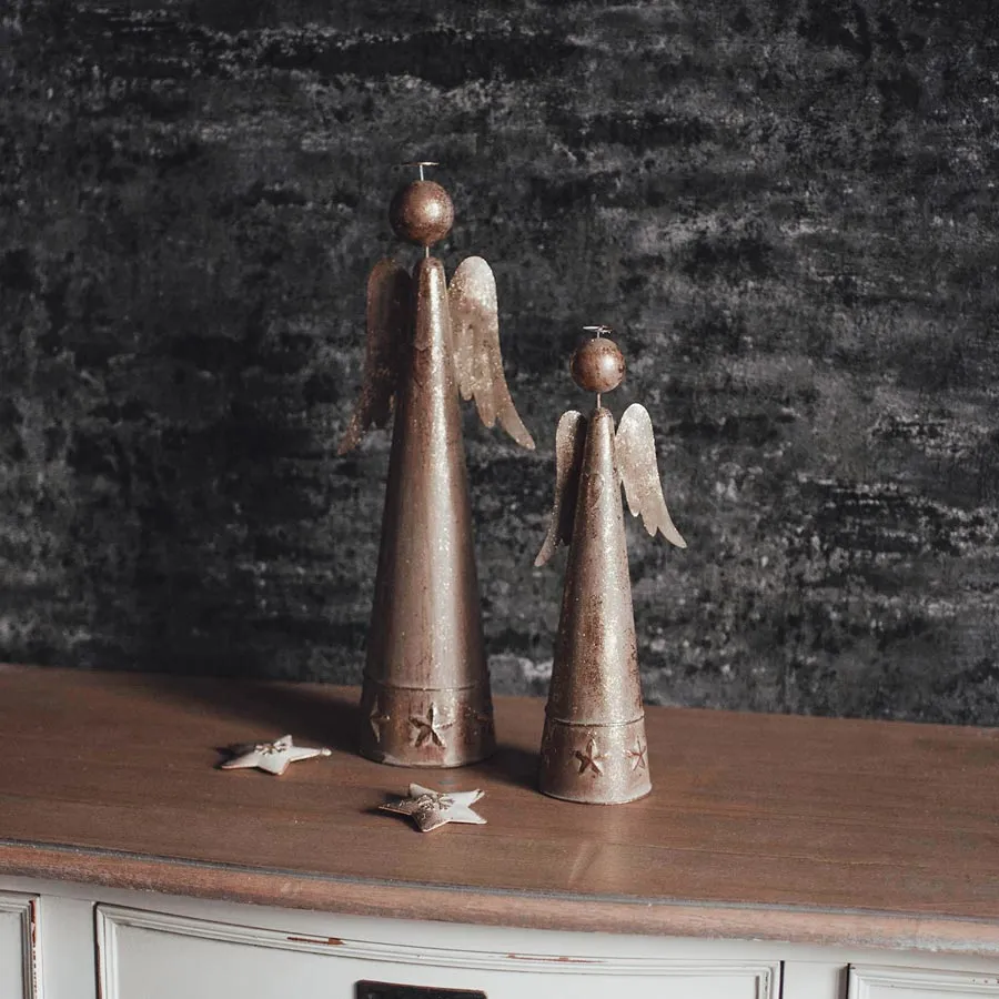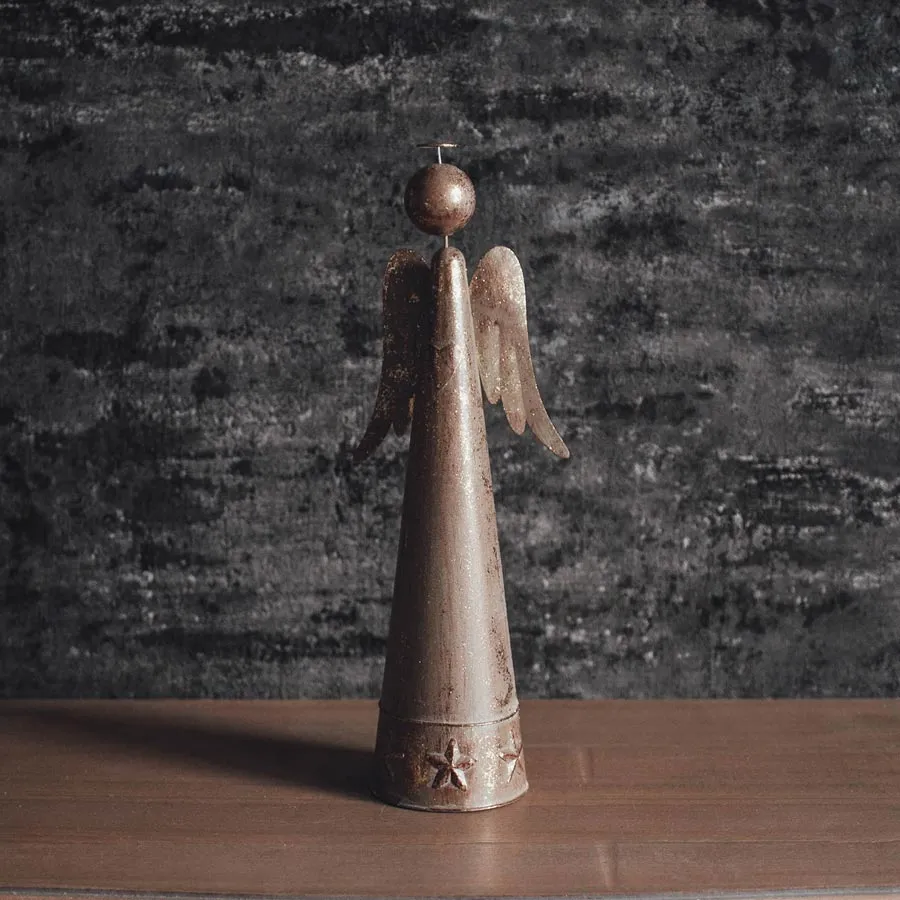 Dekorativer Engel. Maße: 13,5 x 10 cm, Höhe 39,5 cm. Farbe: Gold. Material: Metall.