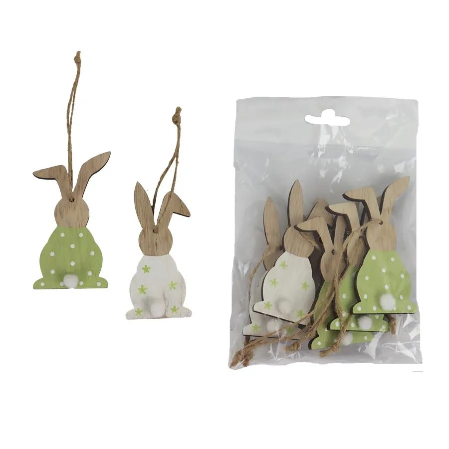 Set dekorativer Hasen. Das Set enthält 6 Hasen. Abmessungen: 4,5 x 0,4 cm, Höhe 8 cm. Farbe: Kombination aus Natur, Grün, Weiß. Material auf Holzbasis.