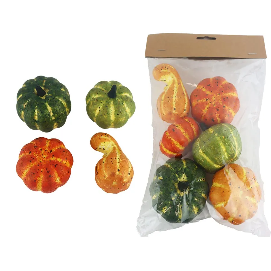 Set mit 6 dekorativen Kürbissen. Maße: Durchmesser 5 – 7 cm, Höhe 3 – 8,5 cm.