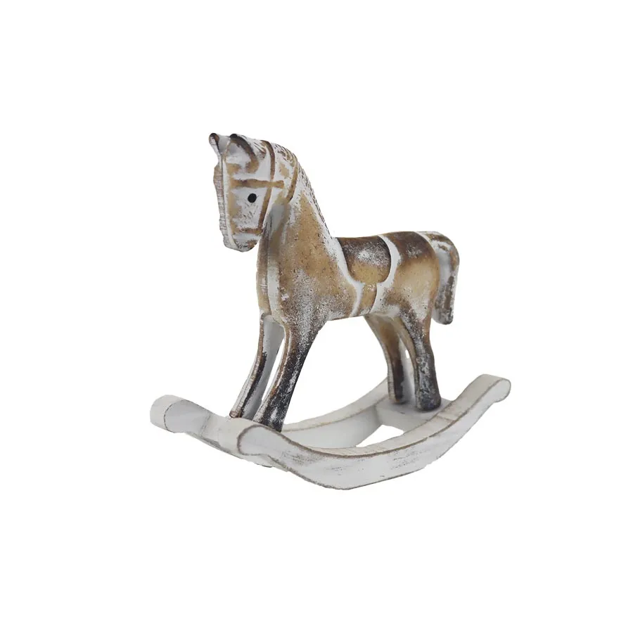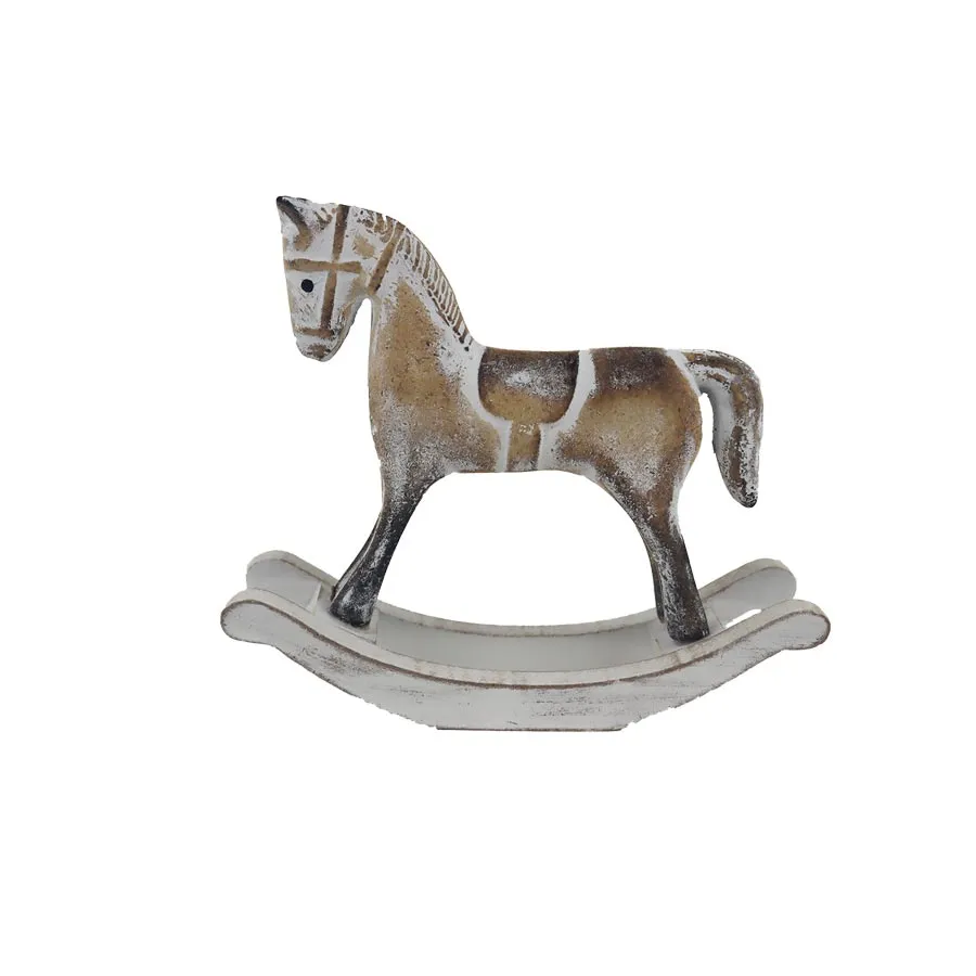 Dekoratives Pferd. Abmessungen: 13 × 4,5 cm, Höhe 11 cm. Farbe: Kombination braun, weiß. Holzbasismaterial.