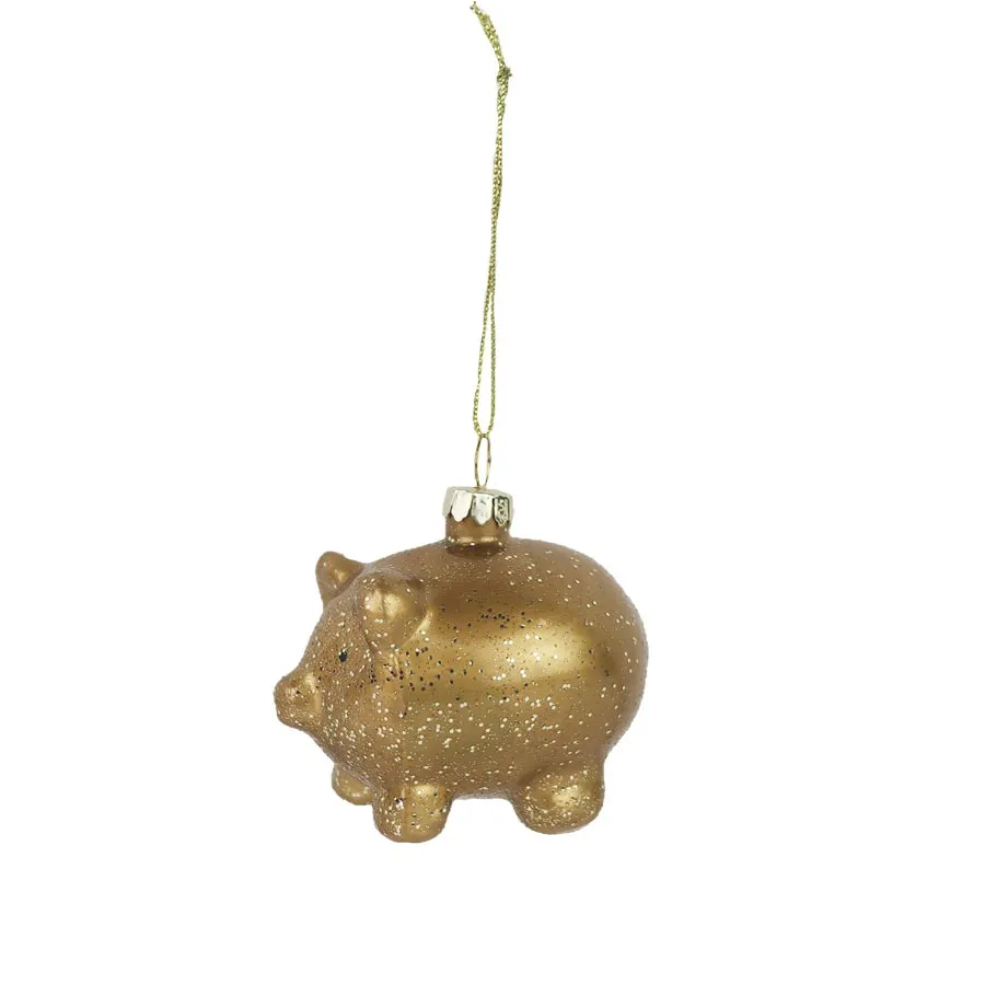 Goldenes dekoratives Sparschwein zum Aufhängen.
