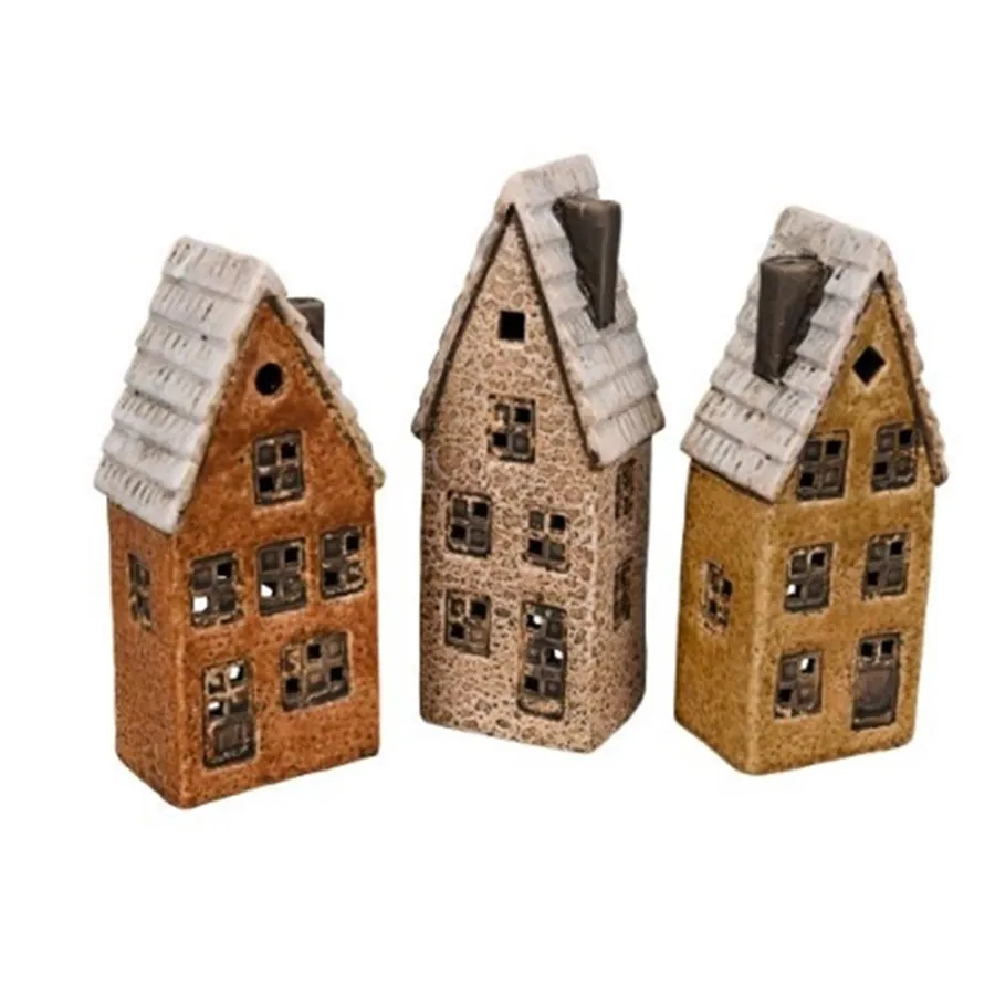 Set von dekorativen Häusern. Das Set enthält 3 Häuser. Abmessungen: 5,5 - 7,5 x 5,5 cm, Höhe 17 - 18,5 cm. Farbe: braun. Material: Keramik.