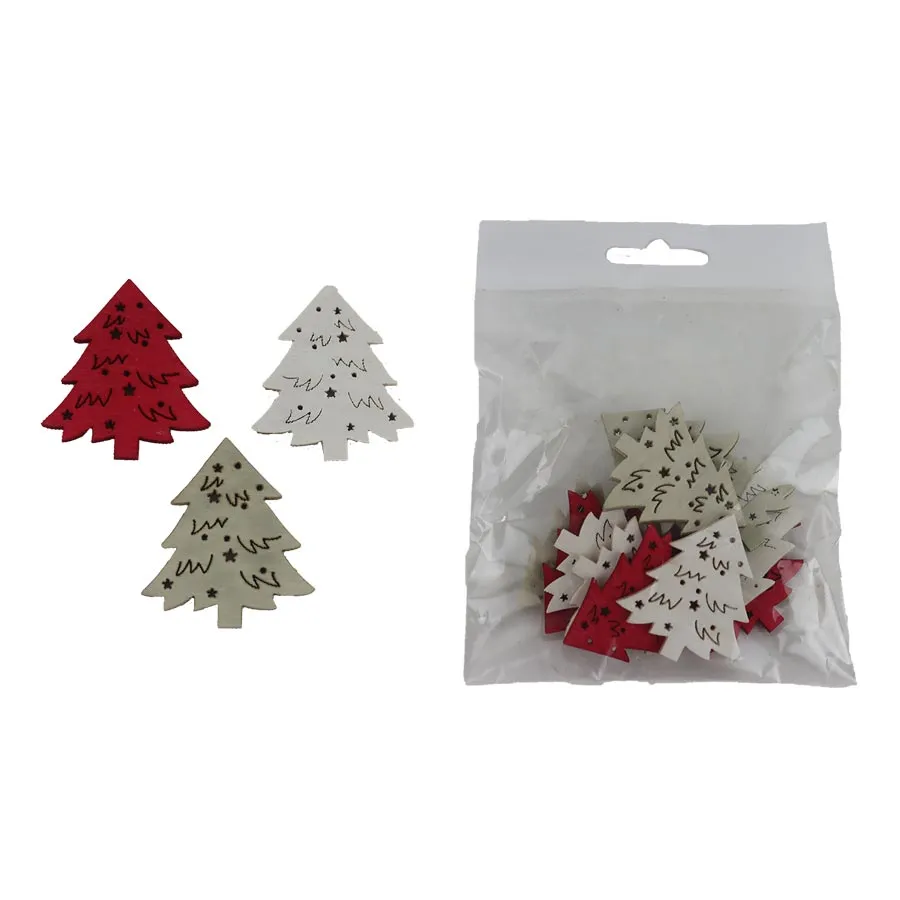 Set dekorativer Bäume. Das Set enthält 12 Bäume. Abmessungen: 3,7 x 0,3 cm, Höhe 4 cm. Farbe: Kombination Rot, Weiß. Material auf Holzbasis.