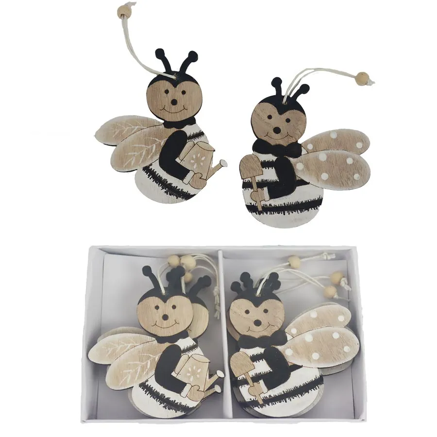 Set dekorativer Bienen zum Aufhängen. Das Set enthält 6 Bienen. Maße: 5,6 - 7 x 0,4 cm, Höhe 8 - 8,5 cm. Farbe: Kombination aus Natur, Schwarz, Weiß. Material auf Holzbasis.