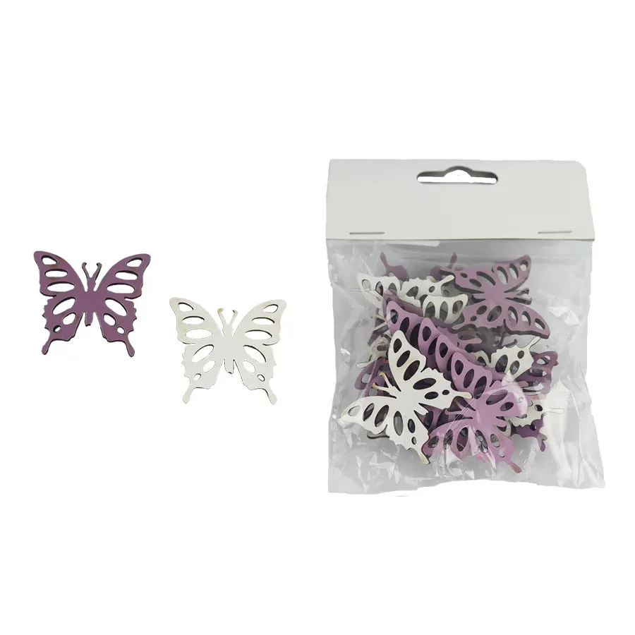 Set dekorative Fliegen. Das Set enthält 12 Fliegen. Maße: 3,5 x 0,2 cm, Höhe 3,5 cm. Farbe: Lila, Weiß-Kombination. Material auf Holzbasis.