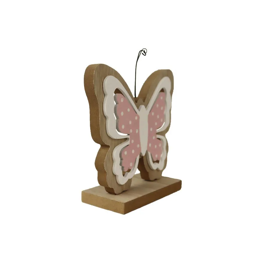 Dekorativer Schmetterling. Abmessungen: 14 × 12 cm, Höhe 4,5 cm. Farbe: Kombination aus Natur mit Rosa, Weiß. Material auf Holzbasis.