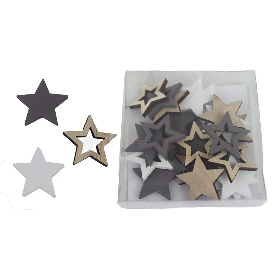 Set dekorativer Sterne. Das Set enthält 24 Sterne. Maße: Farbe: Kombination braun, grau, weiß. Holzbasismaterial.