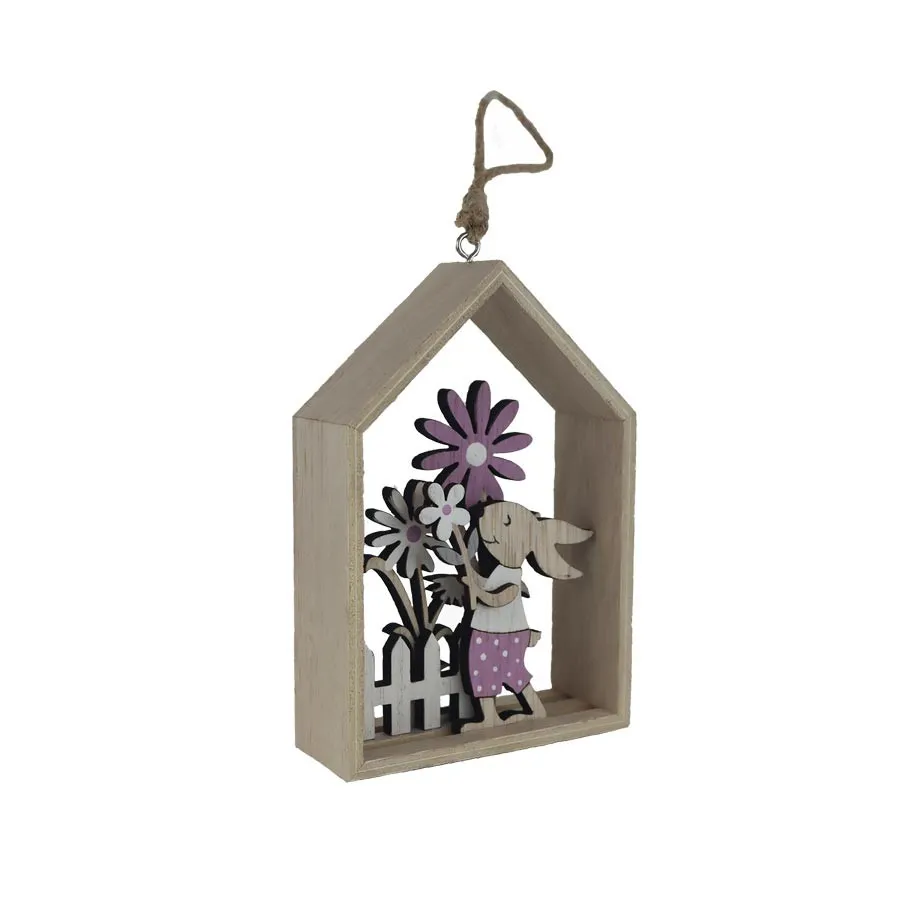 Osterdeko zum Aufhängen. Maße: 8 x 3 cm, Höhe 12 cm. Farbe: Kombination aus Natur, Weiß, Lila. Material auf Holzbasis.