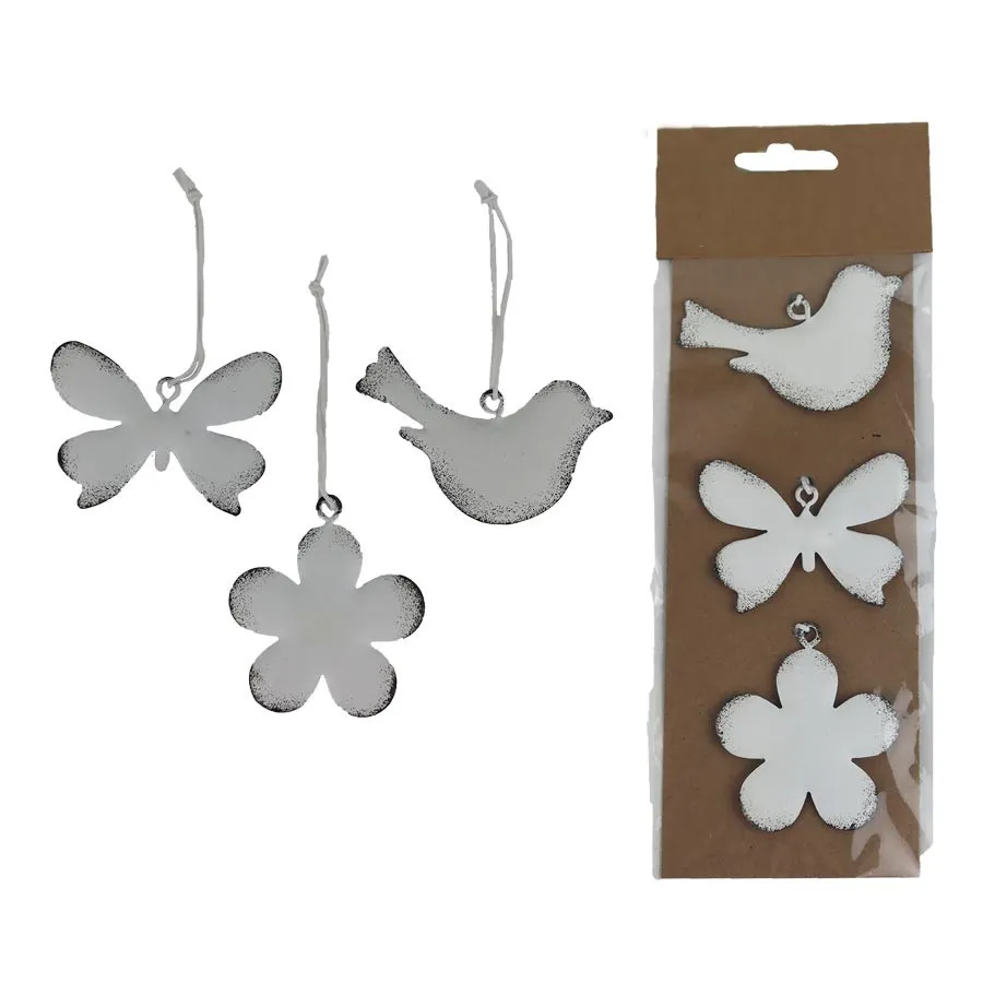 Set Dekorationen zum Aufhängen. Das Set enthält 3 Dekorationen. Abmessungen: 5 - 6,5 x 0,3 cm, Höhe 4 - 5,7 cm. Farbe: weiße Patina. Material: Metall.