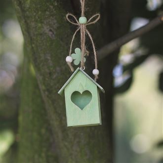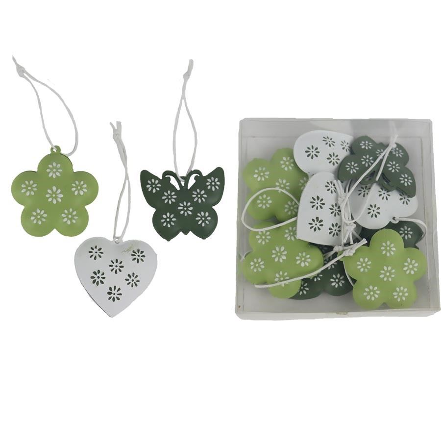 Set Dekorationen zum Aufhängen. Das Set enthält 9 Dekorationen. Maße: 4 x 1,2 cm, Höhe 3,2 - 4 cm. Farbe: Kombination aus Weiß, Grün, Oliv. Material: Metall.