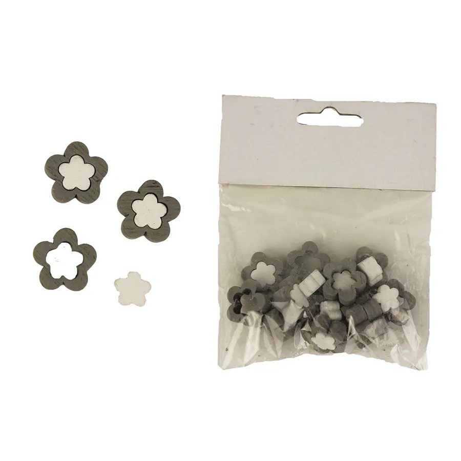 Set enthält kleine Blüten 12 St, große Blüten 12 St. Farbe: Kombination Weiß und Grau. Material: Holz.