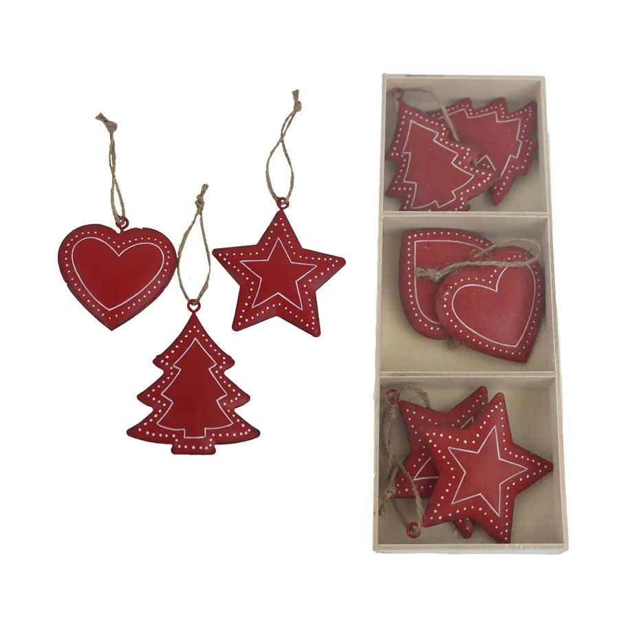 Set Dekorationen zum Aufhängen. Das Set enthält 6 Dekorationen. Abmessungen: 6 - 6,5 x 1 cm, Höhe 5,5 - 7,3 cm. Farbe: Kombination aus Rot und Weiß. Material: Metall.