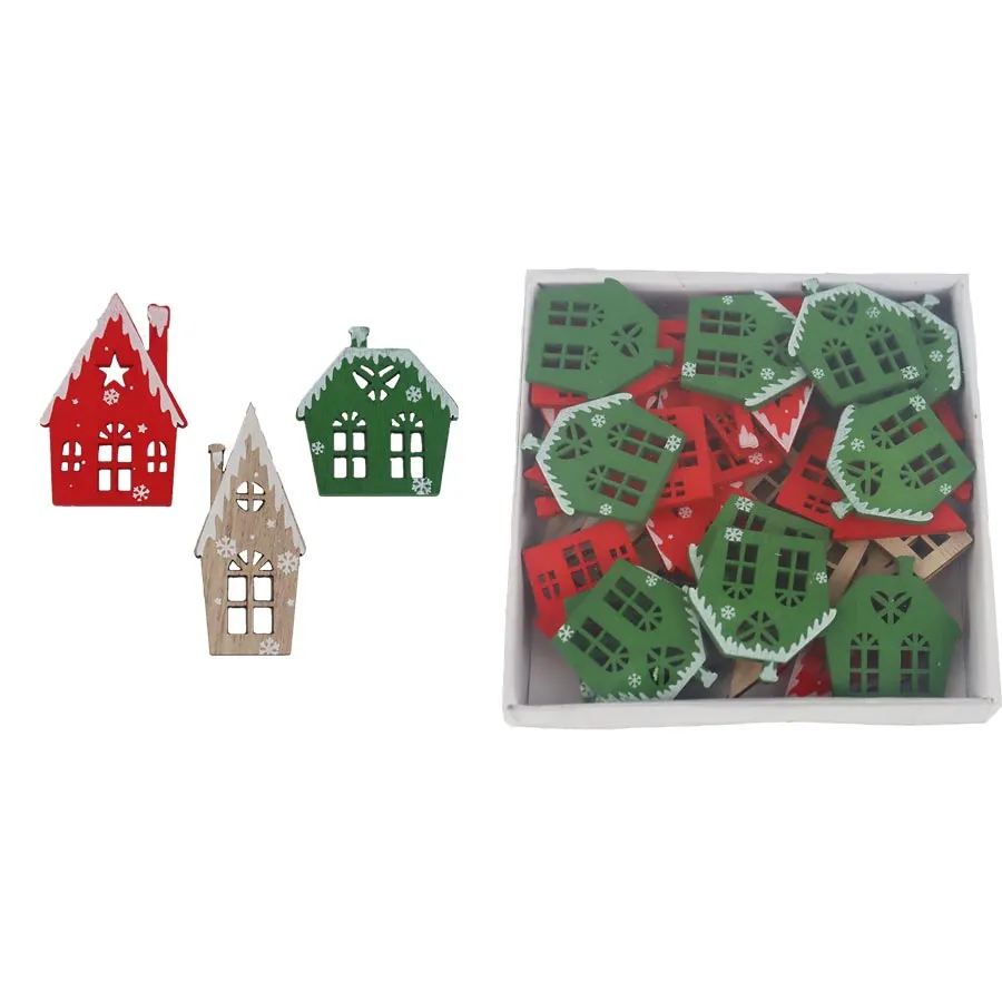 Set von dekorativen Häusern. Das Set enthält 36 Häuser. Maße: Farbe: Kombination rot, grün, braun. Holzbasismaterial.