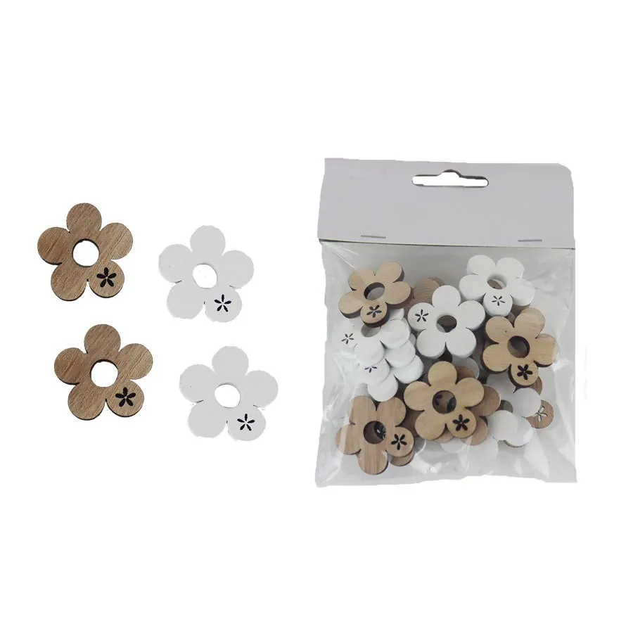 Set dekorativer Blumen. Das Set enthält 24 Blumen. Abmessungen: Durchmesser 2,5 cm, Dicke 0,4 cm. Farbe: Kombination Natur, Weiß. Material auf Holzbasis.