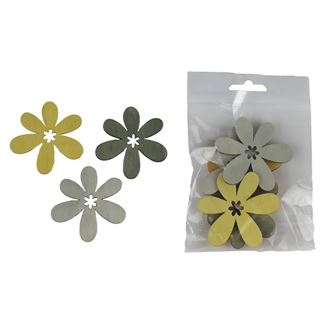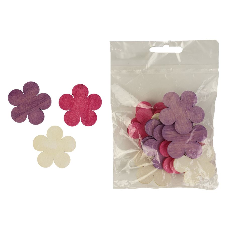 Dekoratives Blumenset. Das Set enthält 12 Blumen. Abmessungen: Durchmesser 4 cm, Dicke 0,3 cm. Farbe: Lila, Rosa, Weiß. Material: MDF.
