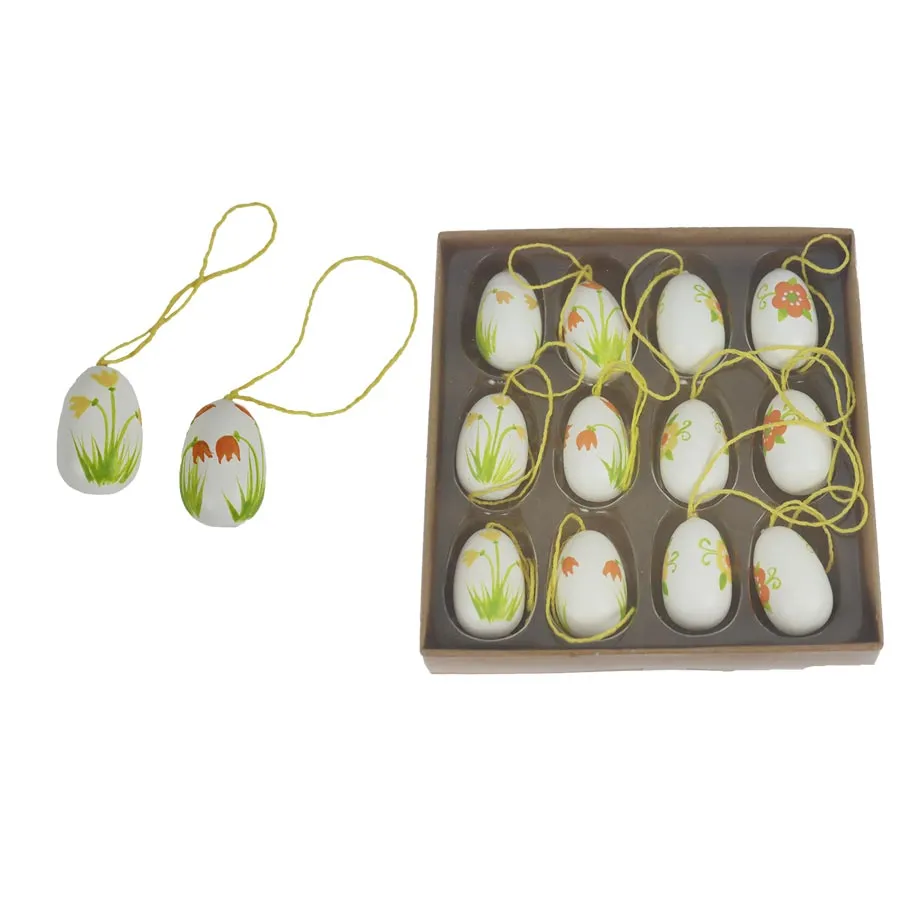 Set Deko-Eier aus Holz zum Aufhängen. Das Set enthält 12 Eier. Maße: Durchmesser 1,6 cm, Höhe 3 cm. Farbe: Kombination aus Weiß, Orange, Gelb. Material: Holz.