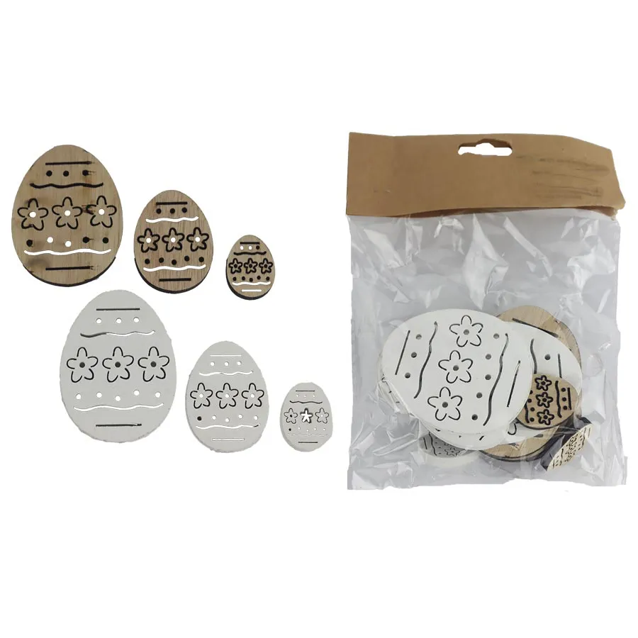 Set dekorative Eier. Das Set enthält 18 Eier in drei Größen. Abmessungen: 2 - 5,3 x 0,5 cm, Höhe 3 - 6,8 cm. Brarva: Kombination weiß, natur. Material auf Holzbasis.