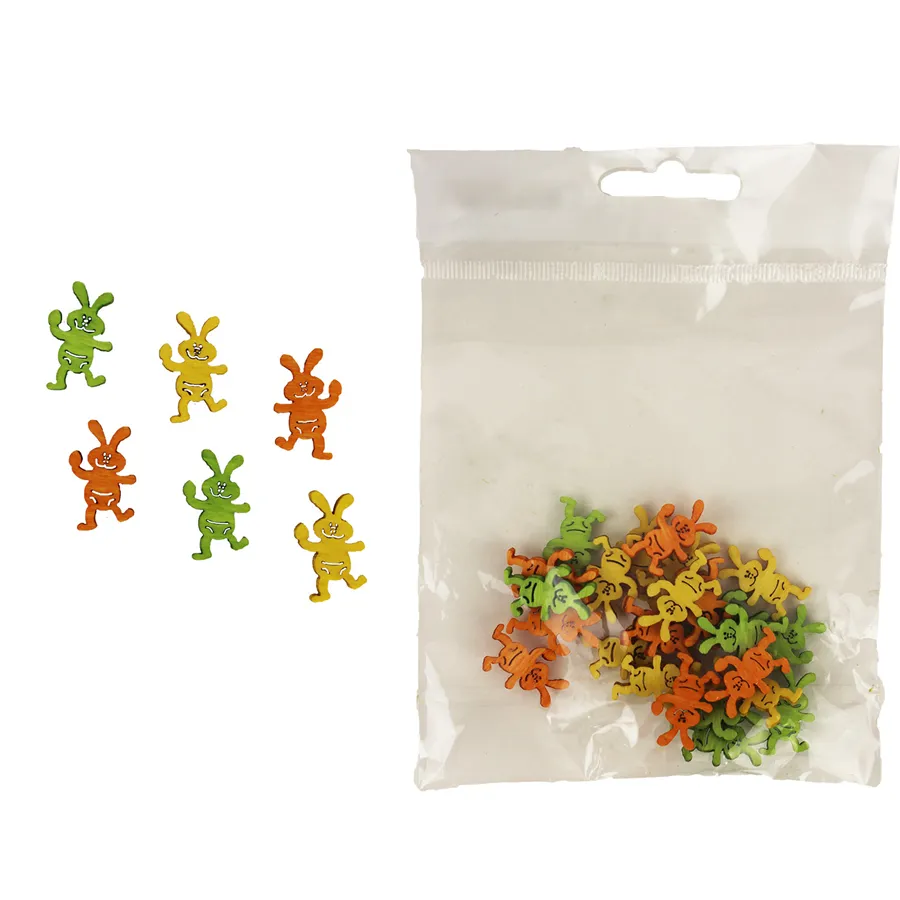 Dekoratives Set Hasen. Das Set enthält 24 Hasen. Maße: 1 x 0,2 cm, Höhe 2 cm. Farbe: grün, gelb, orange. Material: MDF.