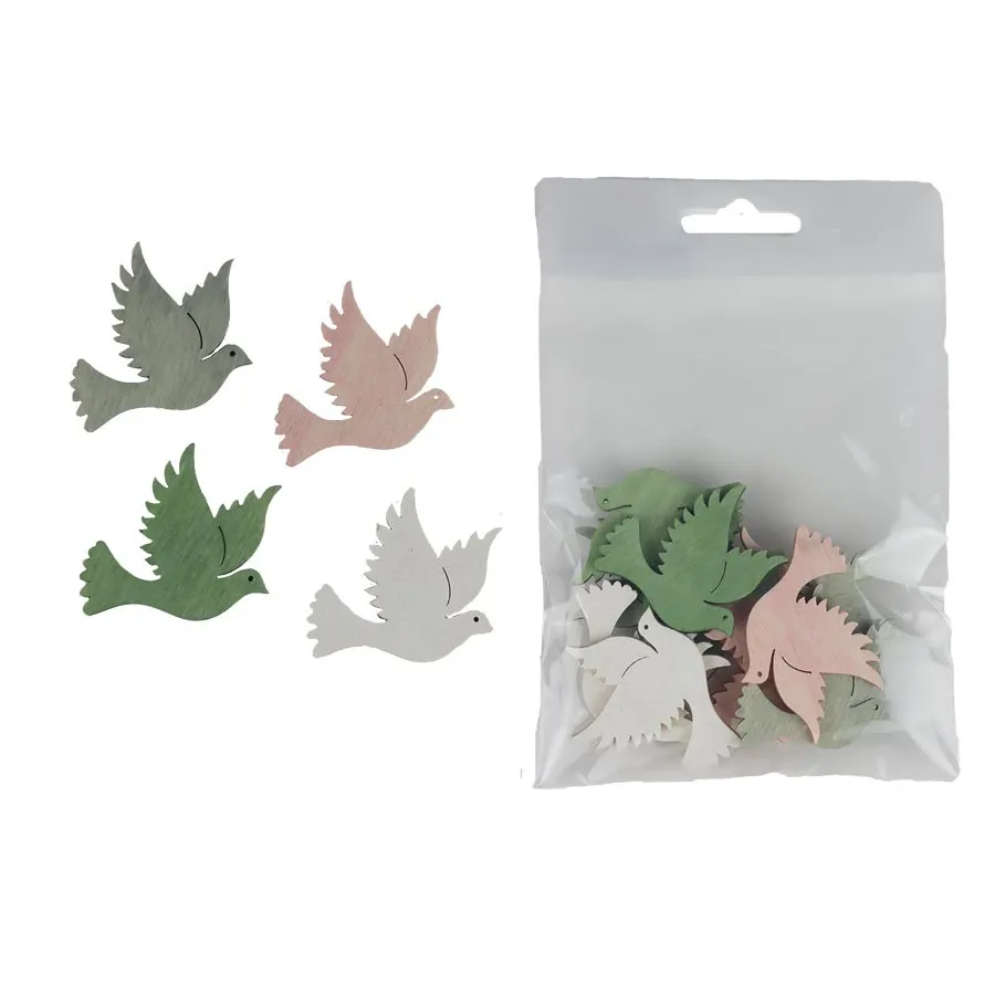 Set dekorativer Tauben. Das Set enthält 12 Tauben. Maße: 4 x 0,3 cm, Höhe 3,5 cm. Farbe: Kombination aus Grün, Weiß, Rosa, Grau. Material auf Holzbasis.