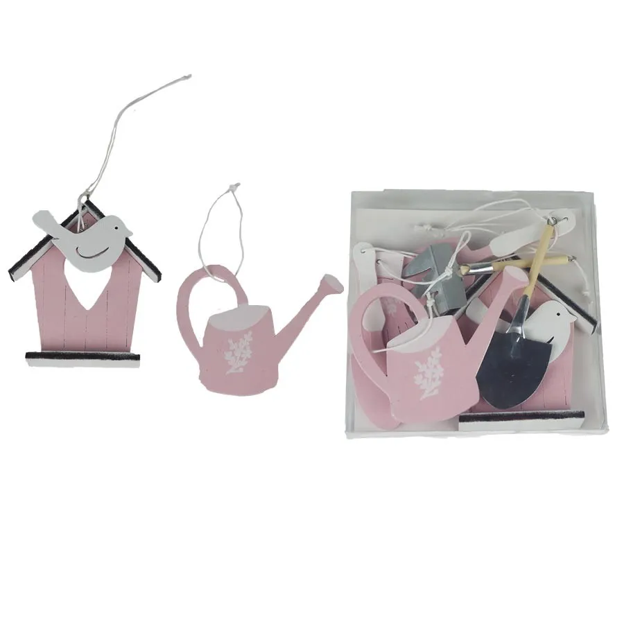 Set Dekorationen zum Aufhängen. Das Set enthält 7 Dekorationen. Abmessungen: 3,5 - 8 x 0,5 - 1 cm, Höhe 6 - 10 cm. Farbe: Kombination aus Rosa und Weiß. Material auf Holzbasis.