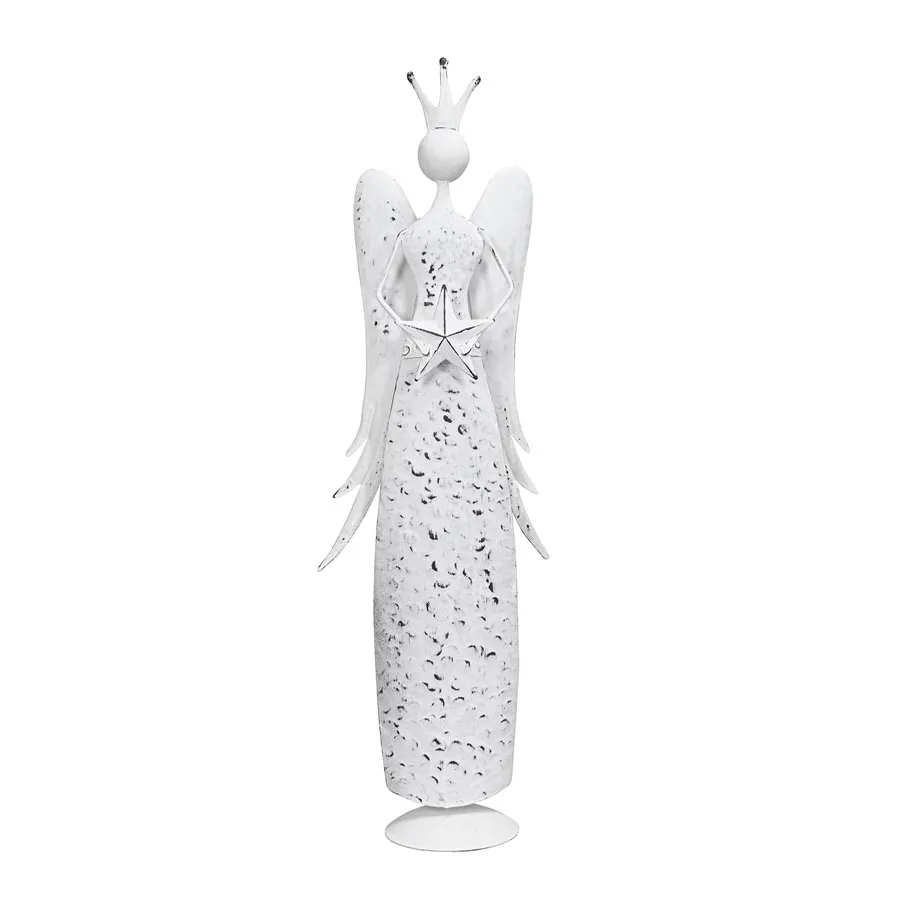Dekorativer Engel aus Metall. Abmessungen : 38 x 25,5 cm, Höhe 19 cm. Farbe : weiß patiniert. Material : Metall.