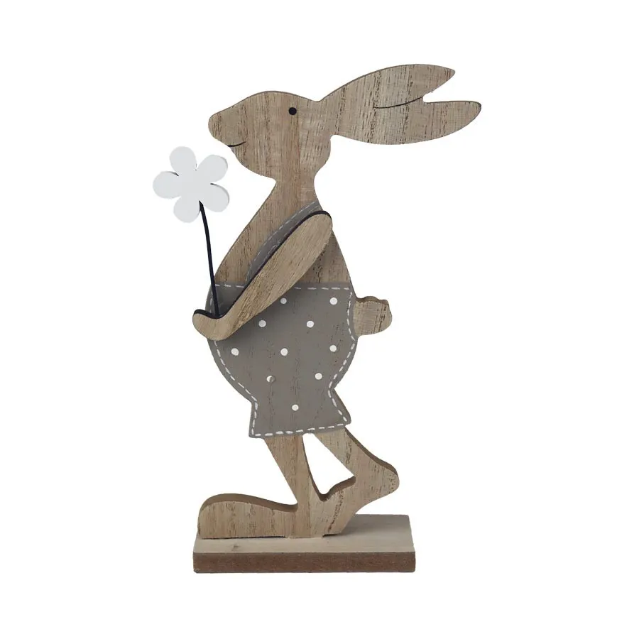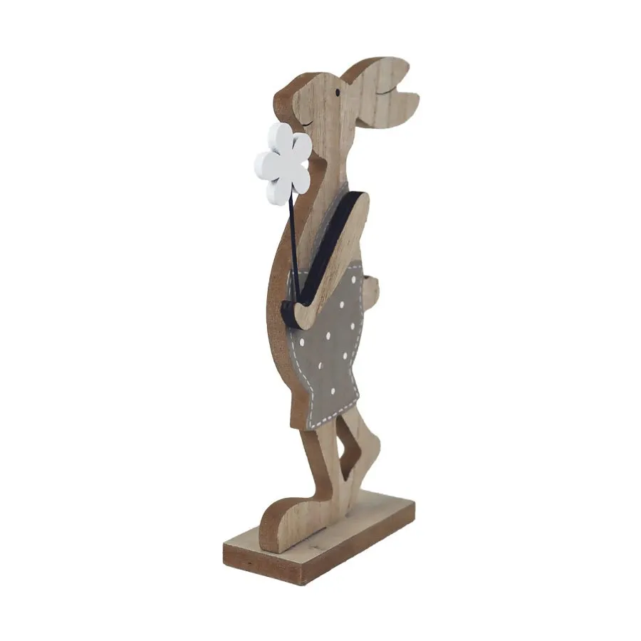 Dekorativer Hase. Maße: 14,5 x 4 cm, Höhe 21,5 cm. Farbe: Natur, Graukombination. Material auf Holzbasis.