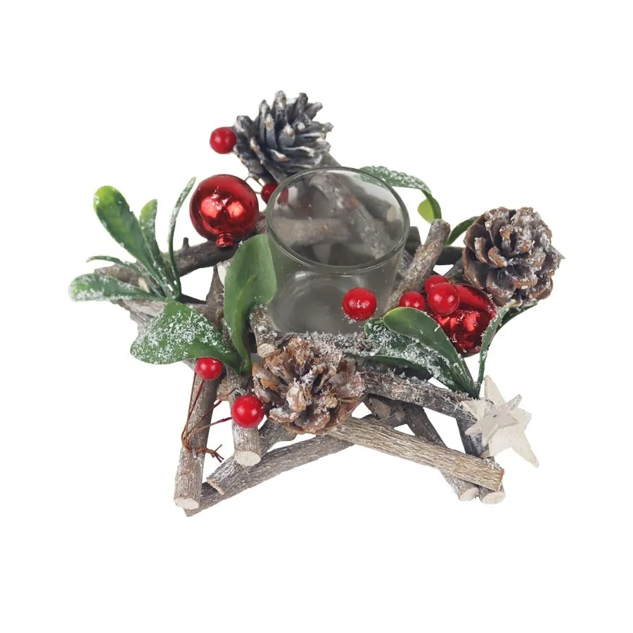 Dekorativer Kerzenleuchter für eine Kerze. Maße: Durchmesser 20 cm, Höhe 8 cm. Farbe: Kombination aus Natur, Grün, Rot, Braun. Material: Natur, Kunststoff, Glas.