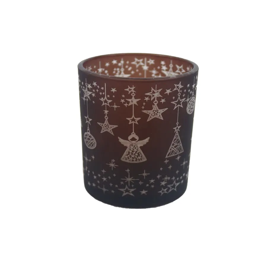 Dekorativer Kerzenhalter. Abmessungen : Durchmesser 9 cm, Höhe 10 cm. Farbe : Kombination von braun, weiß. Material : Glas.
