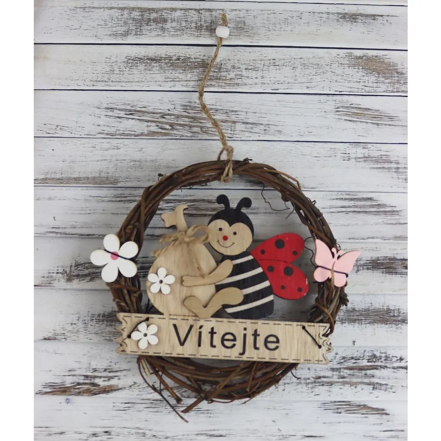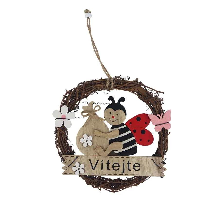 Dekorativer Kranz zum Aufhängen. Maße: Durchmesser 15 cm, Dicke 2,5 cm. Farbe: Kombination aus Natur, Rot, Weiß. Material auf Holzbasis.