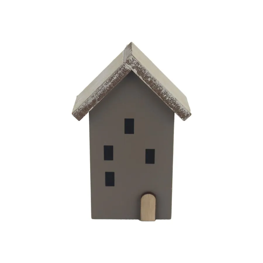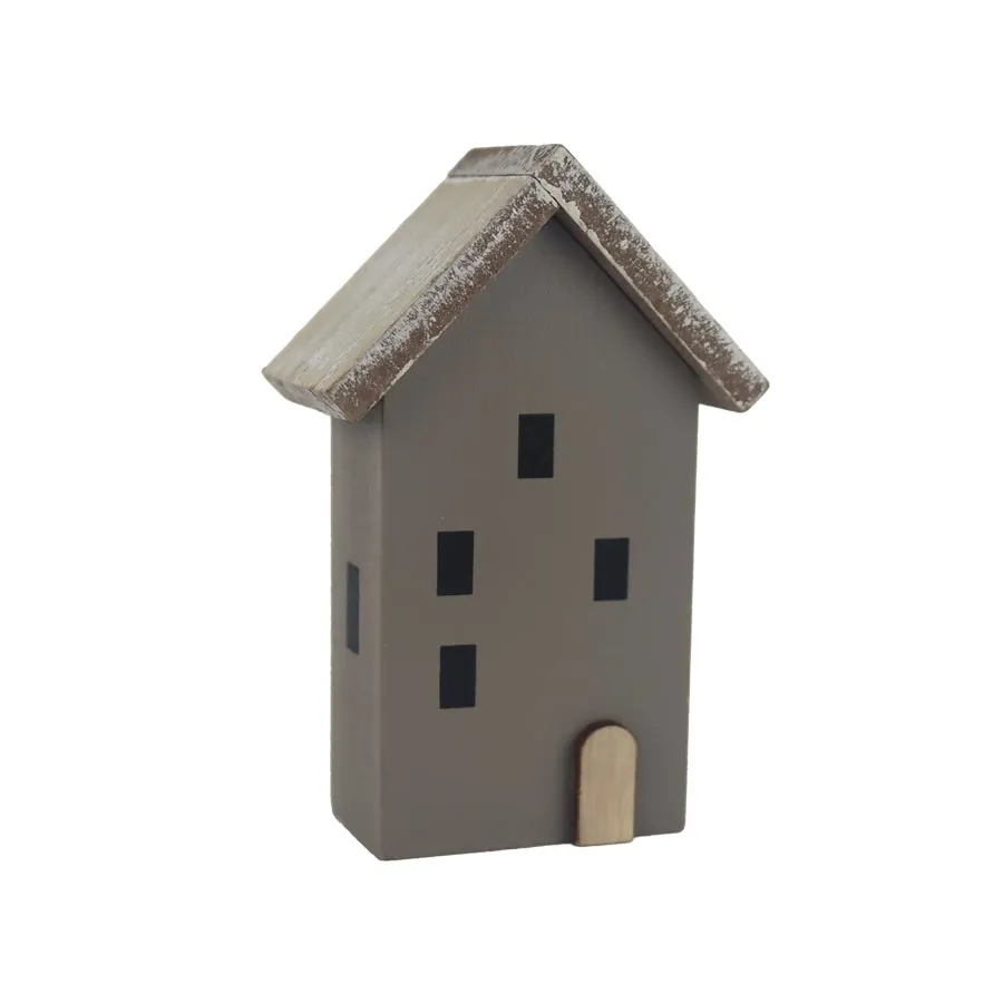 Dekoratives Haus. Maße: 6,5 x 3,5 cm, Höhe 10 cm. Farbe braun. Material auf Holzbasis.