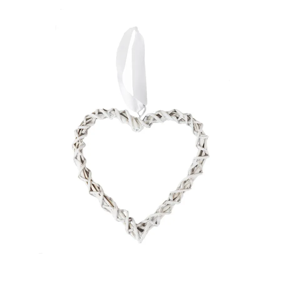 Deko-Herz zum Aufhängen. Abmessungen: 15 x 15 cm, Dicke 2 cm. Weiße Farbe. Material: Korbgeflecht, Draht.