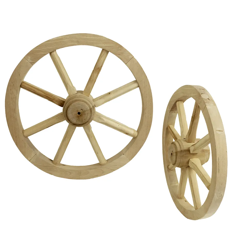 Dekoratives Holzrad. Das Rad hat einen Durchmesser 40 cm, das Rad hat eine Dicke 3 cm, die Mitte dieses Rades hat eine Dicke 11,5 cm.