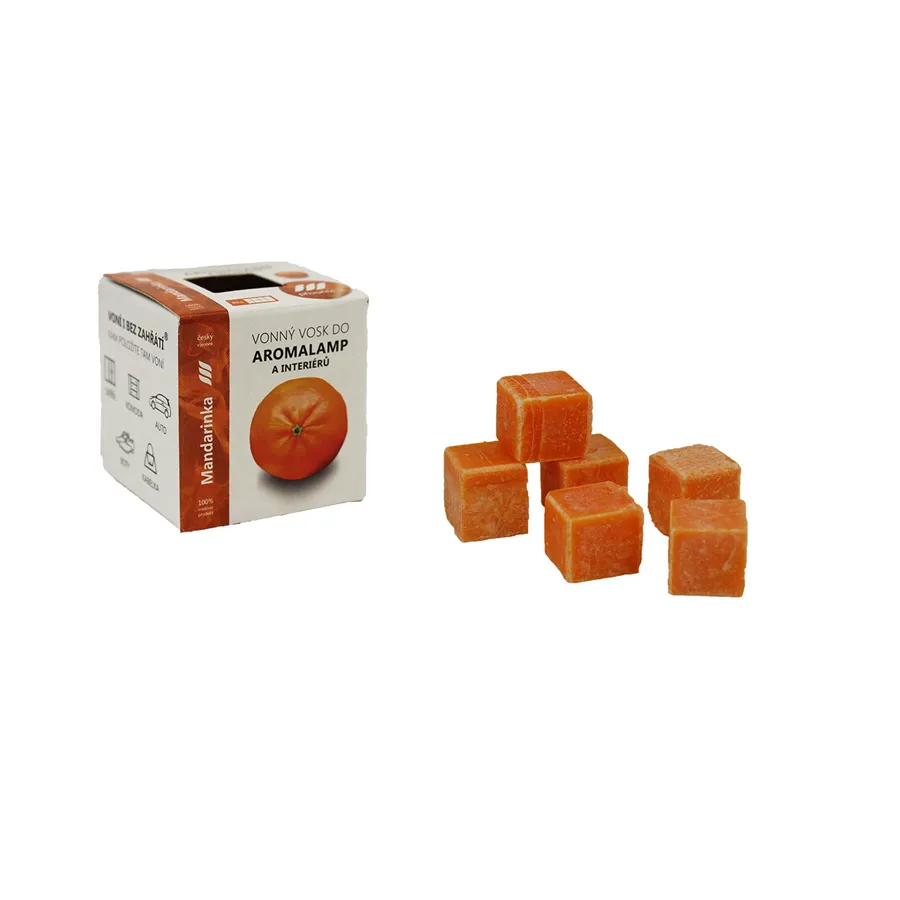 Duftwachs - MANDARINKA T. Die Box misst 4 x 4 x 4 cm. Die Box enthält 8 Wachswürfel mit den Maßen 1,5 x 1,5 x 1,5 cm. Sie können das Wachs sowohl in elektrischen Aromalampen als auch in Teekerzen-Aromalampen verwenden. Sie können das Wachs auch im Innenbereich verwenden – wo auch immer Sie das Wachs hinbringen, es duftet dort.