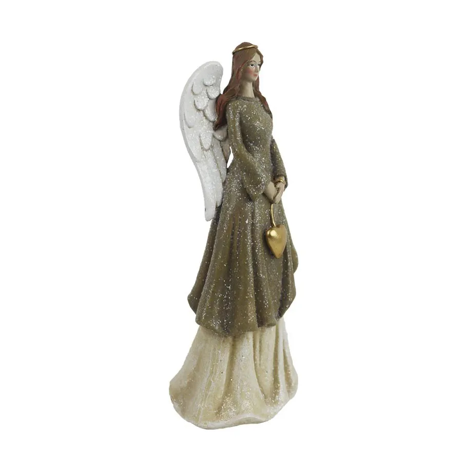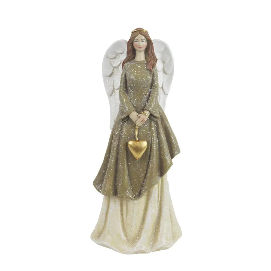 Dekorativer Engel. Abmessungen: 8,5 x 7 cm, Höhe 19 cm. Farbe: Goldkombination, weiß. Material: Polyresin.