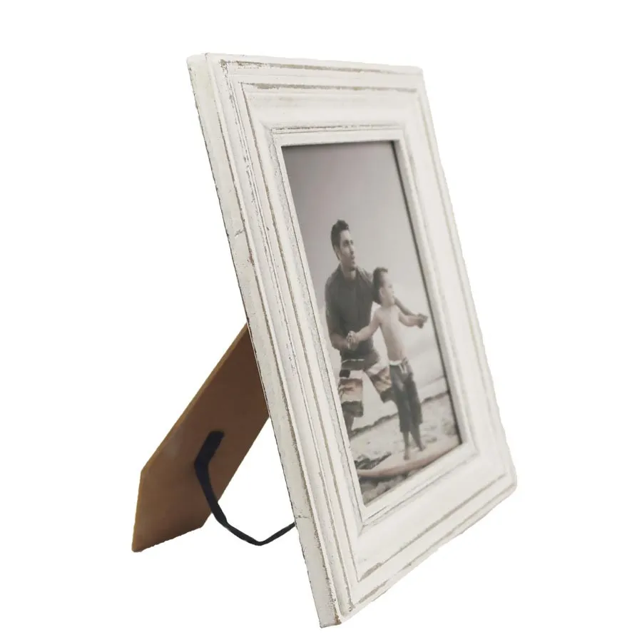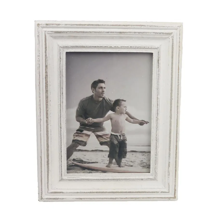 Fotorahmen aus Holz. Abmessungen: 20,5 x 25,5 cm, Dicke 2 cm. Der Fotorahmen ist 11 x 16,4 cm groß für ein Foto. Farbe: Kombination aus Weiß und Grau. Holzwerkstoff, Glas.