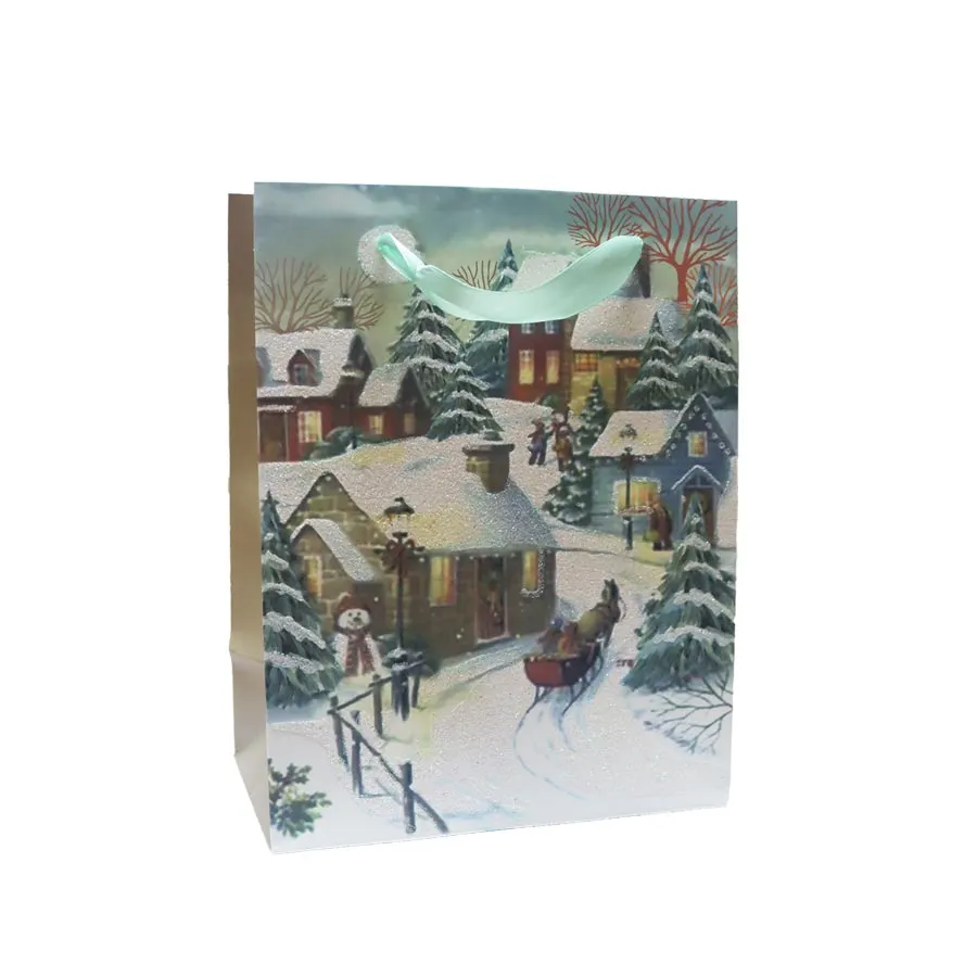 Geschenktüte aus Papier mit Winterlandschaftsmotiv.