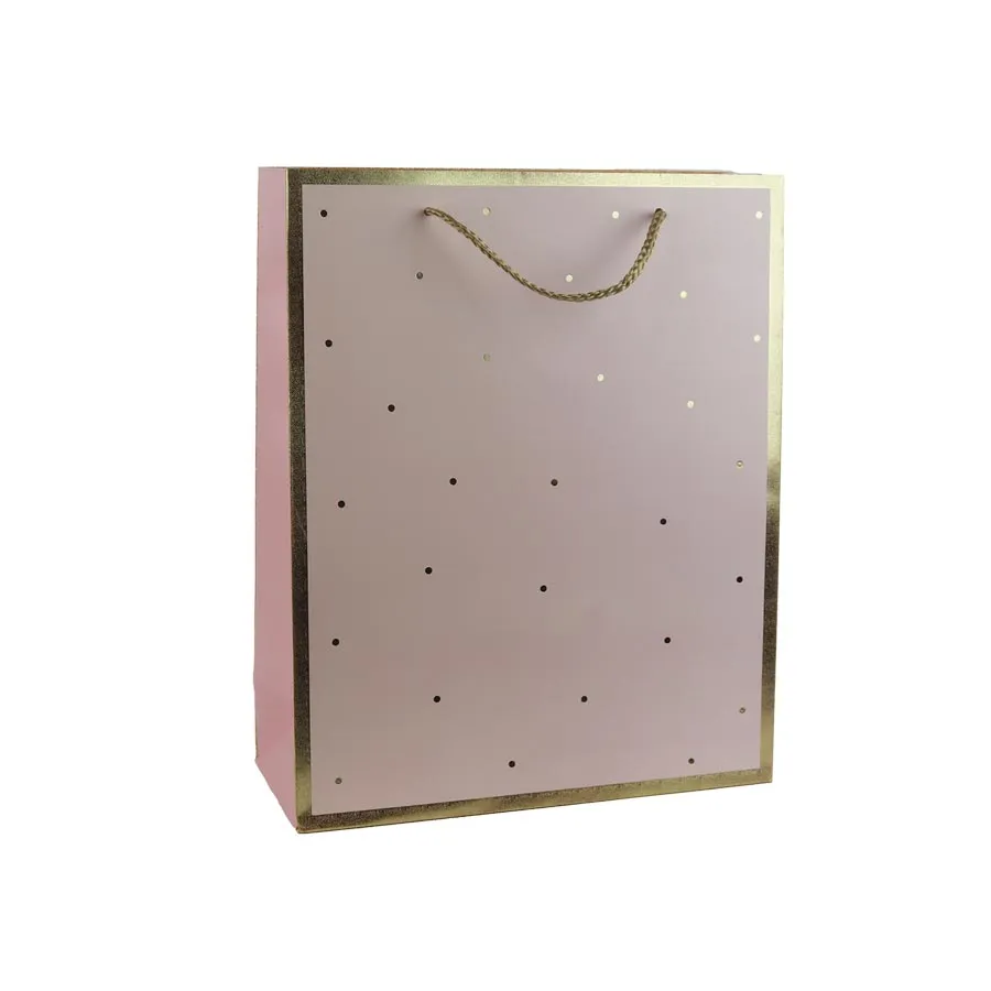 Geschenktüte mit Tupfen. Abmessungen : 26 × 10 cm, Höhe 32 cm. Farbe : Kombination aus Rosa und Gold. Material : Papier.