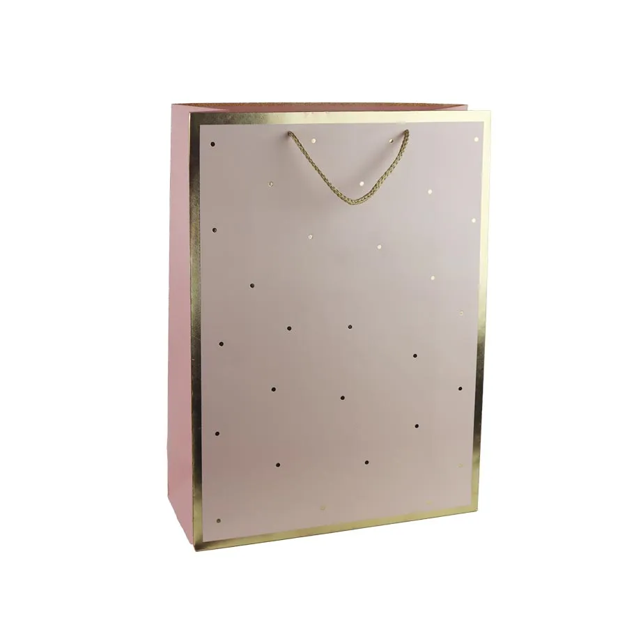 Geschenktüte mit Tupfen. Abmessungen : 31 × 12 cm, Höhe 42 cm. Farbe : Kombination aus Rosa und Gold. Material : Papier.