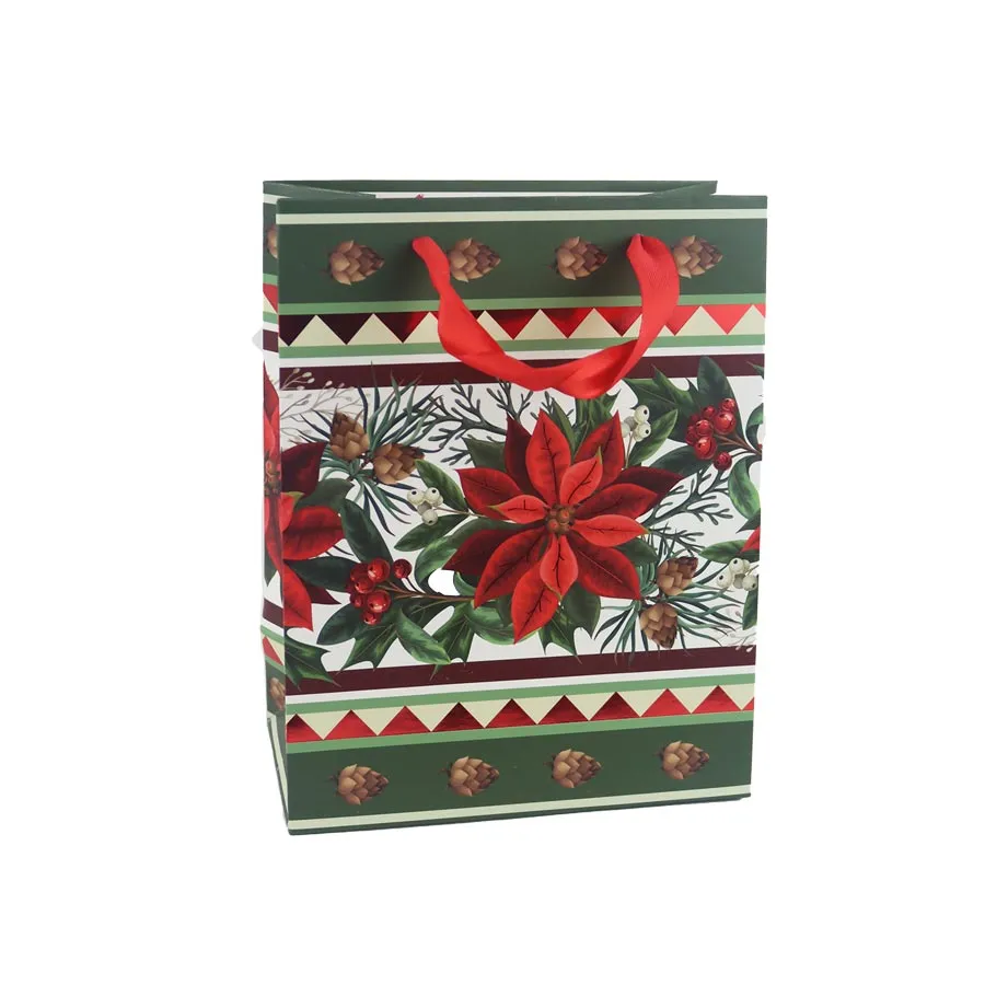 Geschenkbeutel für Weihnachten. Abmessungen : 18 x 10 cm, Höhe 23 cm. Farbe : Kombination aus Grün und Rot. Material : Papier.