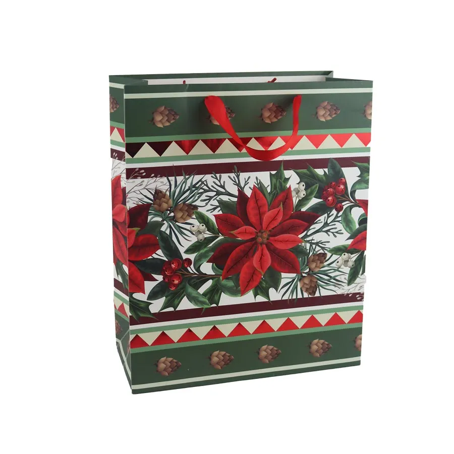 Geschenktüte für Weihnachten. Abmessungen : 26 x 12 cm, Höhe 32 cm. Farbe : Kombination aus Grün und Rot. Material : Papier.