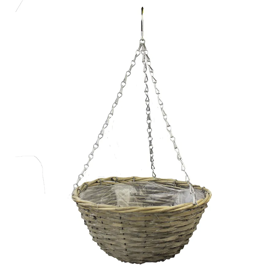 Hängender Blumentopf mit Folie. Der Blumentopf hat einen Durchmesser 32 cm, eine Höhe 16 cm. Farbe: Grau. Material: Weide, Kunststoff.