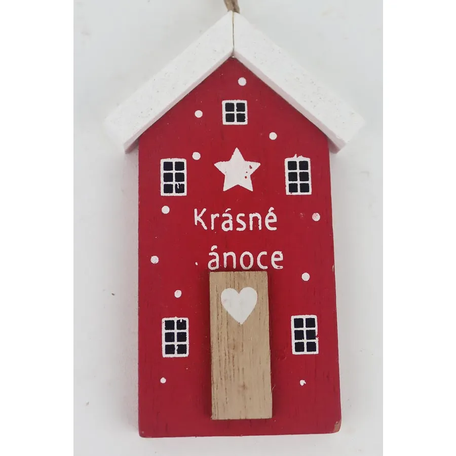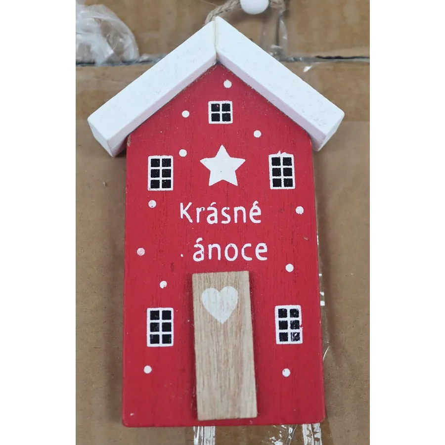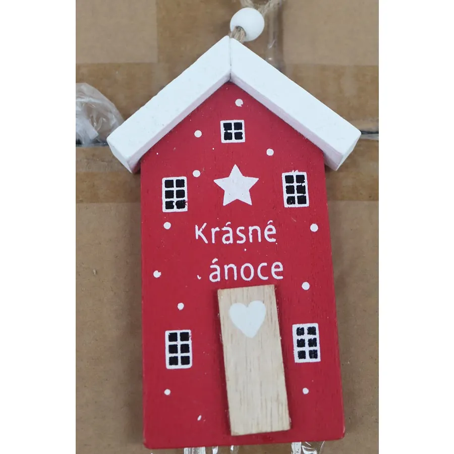 Dekoratives Haus zum Aufhängen mit der Aufschrift „Frohe Weihnachten“.