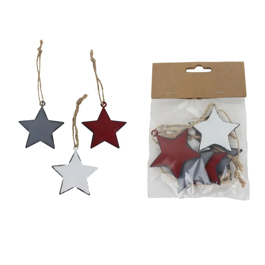 Set dekorativer Sterne zum Hängen. Das Set enthält 6 Sterne. Maße: Farbe: Kombination rot, weiß, grau. Material: Metall.